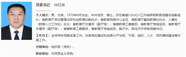 近日,济宁学院网站更新“现任领导”信息,仲红波已任济宁学院党委书记。