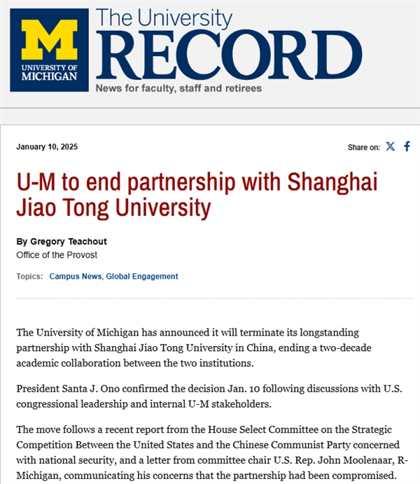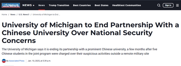 2、https://www.usnews.com/news/us/articles/2025-01-10/university-of-michigan-to-end-partnership-with-a-chinese-university-over-national-security-concerns#:~:text=The%20University%20of%20Michigan%20says%20it%20is%20ending,joint%20program%20were%20charged%20over%20their%20suspicious%20ac