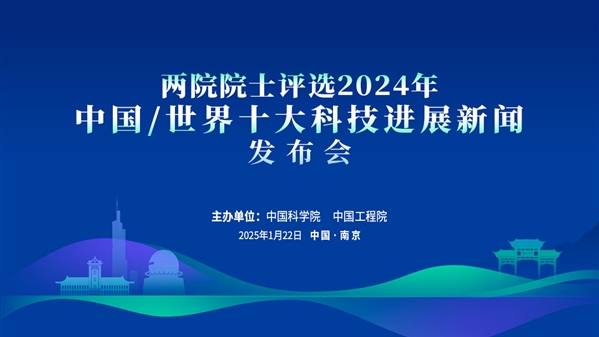 两院院士评选“2024年中国/世界十大科技进展新闻”发布会于2025年1月22日在南京举行。此次发布会由中国科学院、中国工程院主办。自1994年以来,两院院士评选“中国/世界十大科技进展新闻”活动已成功举办30届,是科技界历史最悠久的科普评选活动之一。该活动旨在向公众传播国内外科技发展动态,普及科学技术。评选结果经新闻媒体广泛报道传播后,在社会上产生了强烈反响,使公众进一步了解了年度国内外科技发展的动态,对宣传、普及科学技术起到了积极作用。