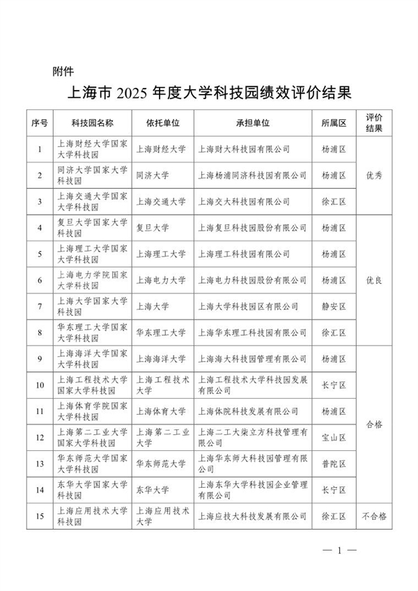 依据《中共上海市委办公厅上海市人民政府办公厅关于印发〈关于加快推进我市大学科技园高质量发展的指导意见〉的通知》(沪委办〔2020〕47号)、《上海市科学技术委员会上海市教育委员会上海市财政局国家税务总局上海市税务局关于印发〈上海市科技创新创业载体管理办法〉的通知》(沪科规〔2023〕12号),市科委、市教委组织全市15家大学科技园开展了2025年度绩效评价工作,现将评价结果予以发布。
