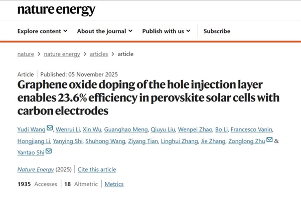 碳电极钙钛矿太阳能电池创造23.6%最高效率纪录