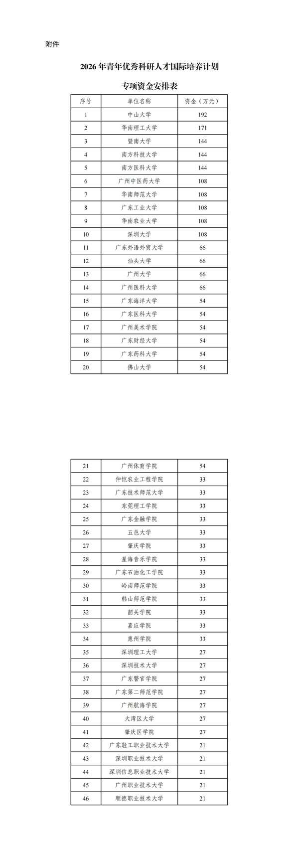 为增强我省高校博士生和博士学位青年教师的国际化水平,提升交流合作水平,加快高等教育内涵式发展,结合高校实际,我厅研究制定了2026年省财政青年优秀科研人才国际培养计划专项资金安排方案(详见附表)。现根据《广东省人民政府关于印发广东省省级财政专项资金管理办法(2025年修订)》(粤府〔2025〕56号)的有关规定,对经费安排予以公示,公示期自2025年11月19日至2025年11月25日,共5个工作日。