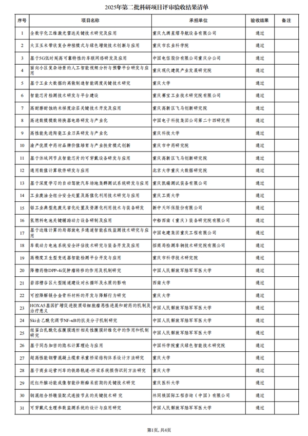 按照重庆市科研项目相关管理规定,市科学技术局委托第三方管理机构组织科研项目评审验收。现对近期验收的科研项目进行公示(详见附件),公示时间为2025年11月19日至11月25日。