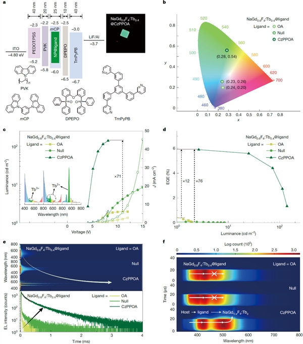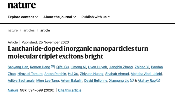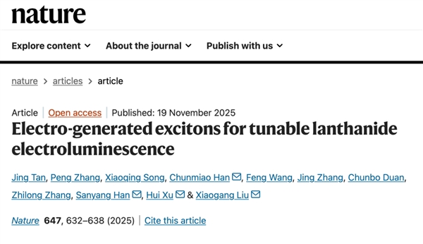 相关研究成果以“捕获电生激子实现可调谐的稀土纳米晶电致发光”(Electro-generated excitons for tunable lanthanide electroluminescence)为题于北京时间11月20日在线发表于《自然》(Nature)。