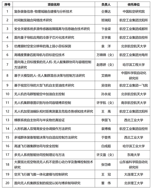 为进一步推动中国空天科技的持续创新与高水平自立自强,学会自2025年起设立“中国航空学会青年科学家基金(制导、导航与控制领域)”,资助具备突出发展潜力的青年科技人员自主选择研究方向开展研究项目。年度评审工作现已按照《中国航空学会青年科学家基金管理办法》完成。本次提名共收到由44名学会制导、导航与控制分会委员提名的40份提名书,其中39份通过形式审查。经过会议答辩评审,拟对20个项目进行资助。现将拟资助项目基本信息予以公示,接受社会监督,公示期为7天(2025年11月22日至11月29日)。如对拟资助项目有异议,请于公示期间以书面形式提出,提出异议的单位、个人应当表明真实身份,学会科技发展部将对异议者的身份予以保密。异议材料请寄送北京市朝阳区世奥国际中心A座30层中国航空学会科技发展部(邮编100029),电话:13810315538。