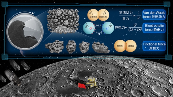 那么,这种“粘性”从何而来?精细成分分析表明,月壤中含有极少量磁性矿物且不含任何黏土矿物,因此排除了磁力和胶结作用的影响。研究团队进一步发现其休止角增大主要在于三种微观粒间力的协同作用:摩擦力、范德华力和静电力。其中,摩擦力的作用与颗粒表面粗糙度正相关,范德华力与静电力的作用则随颗粒尺寸减小而显著增强。