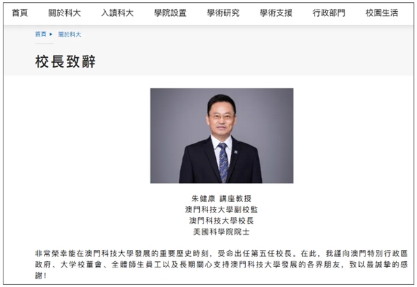 据澳门科技大学官网显示,现南方科技大学前沿生物技术研究院院长朱健康,已于2026年1月起出任澳门科技大学校长一职,原校长李行伟已卸任。朱健康为澳门科技大学的第五任校长。