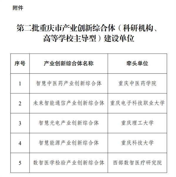根据《关于印发〈重庆市产业创新综合体建设方案(2024—2027年)〉的通知》(渝经信发〔2024〕64号),经各有关科研机构和高等学校申报、市级评审、社会公示等程序,市科技局、市经济信息委联合确定了第二批重庆市产业创新综合体(科研机构、高等学校主导型)建设单位名单,现予以公布。