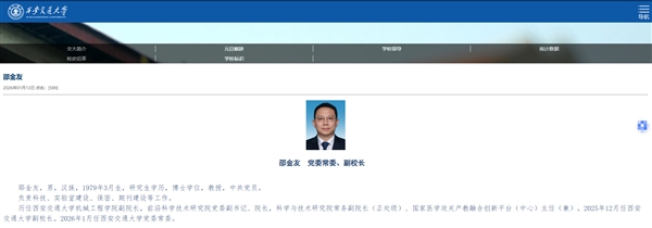 据西安交通大学官网“校领导”一栏更新后显示,邵金友已任西安交通大学党委常委、副校长。