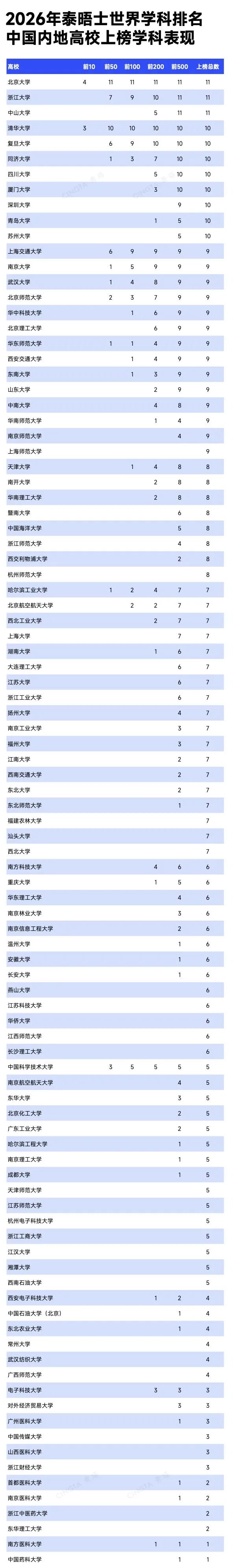 中国内地高校共有12所高校50个学科排名世界前50,其中北京大学11个,清华大学10个,浙江大学7个,上海交通大学、复旦大学各6个,中国科学技术大学3个,北京师范大学2个,南京大学、武汉大学、同济大学、哈尔滨工业大学和华东师范大学各1个学科。