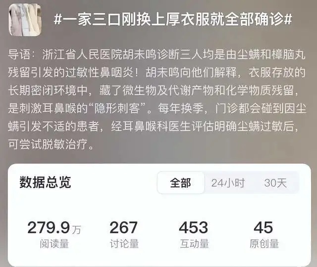 据微博内容描述,由于天气突然转凉,杭州王女士一家人未经充分晾晒,便匆忙穿上了久置的厚衣物。不久后,家庭成员相继出现不适症状:王女士的丈夫率先“中招”,开始打喷嚏、流清水鼻涕,误以为是感冒,但服用了3天感冒药却不太见效;紧接着,王女士感到喉咙发痒,异常难受;他们的女儿则出现了鼻塞症状,夜间因鼻部不适难以入眠。随后,一家三口来到医院就诊。医生详细询问病史后发现,问题就出在那些未经处理直接上身的厚衣物上。结合鼻内镜检查显示的鼻腔黏膜苍白水肿表现,以及过敏原检测结果,医生最终确认三人都是因尘螨和樟脑丸残留引发的过敏性鼻炎。