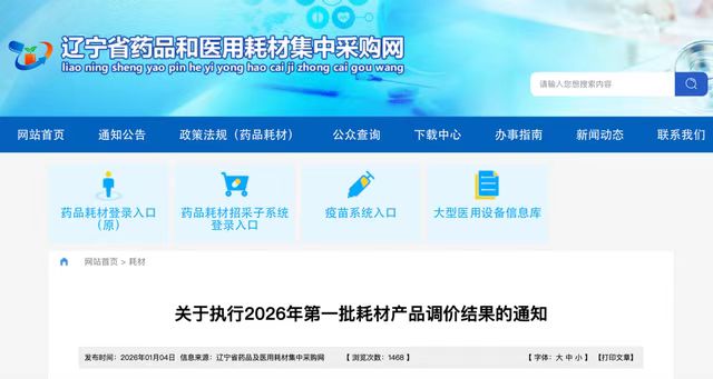 1月4日,辽宁省公共资源交易中心发布《关于执行2026年第一批耗材产品调价结果的通知》,对1086个耗材产品进行调价,涵盖金属骨针、植入式左心室起搏电极导线、一次性心电电极等,新价格1月7日起正式执行。