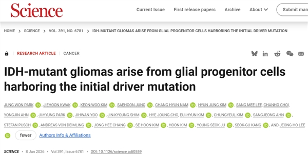 2026年1月8日,韩国科学技术院Jeong Ho Lee团队在Science 在线发表题为“IDH-mutant gliomas arise from glial progenitor cells harboring the initial driver mutation”的研究论文,该研究对来自70个个体的142个组织进行了深度测序,包括肿瘤、肿瘤周围皮层或脑室下区和血液。37.9%的患者(29例中的11例)在肿瘤周围皮层发现低水平的IDH突变。