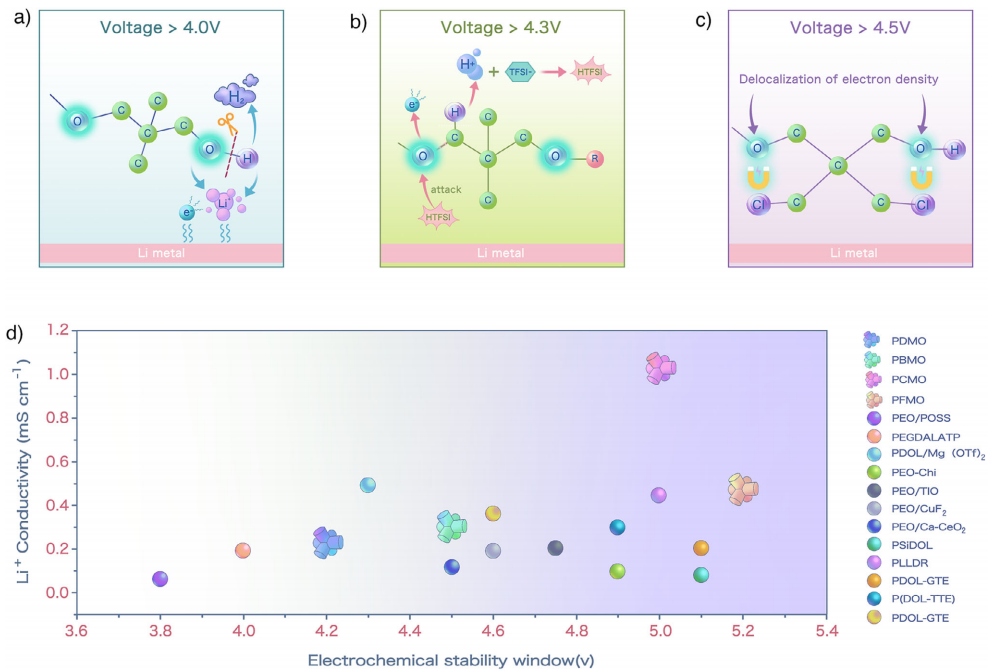 早期研究主要通过引入无机填料、利用阳离子-阴离子、聚合物-离子或路易斯酸碱相互作用来提升聚醚电解质的离子电导率,并实现LFP电池的稳定循环。但这些方法未能解决其固有的氧化稳定性差的问题,限制了与高压正极的兼容性,阻碍了更高能量密度的实现。聚醚电解质在高电压下的不稳定性主要源于末端─OH基团中的氧原子,其部分负电荷使其成为活性位点,易引发电子转移、产氢及生成烷氧基锂等副反应。已有研究通过引入交联剂消除末端羟基,将电化学稳定窗口拓宽至4.3 V,但交联网络往往因刚性增强而阻碍锂离子快速传输,且仍未解决主链醚氧在>4.3 V下的氧化脱氢问题。