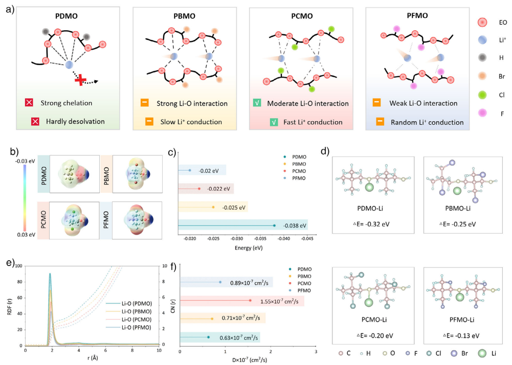 图2:机理计算。(a) 四种聚合物Li+配位强度示意:PCMO“适度”最优;(b) 静电势图:Cl降低醚氧电子云最均衡;(c) 醚氧静电势值定量:F>Cl>Br>H;(d) 结合能:PCMO −0.20 eV,兼顾解离与迁移;(e) RDF+CN:PCMO第一壳层Li-O配位数降至2.55;(f) MSD扩散系数:PCMO Li+扩散最快(1.55×10-7 cm2 s-1)。