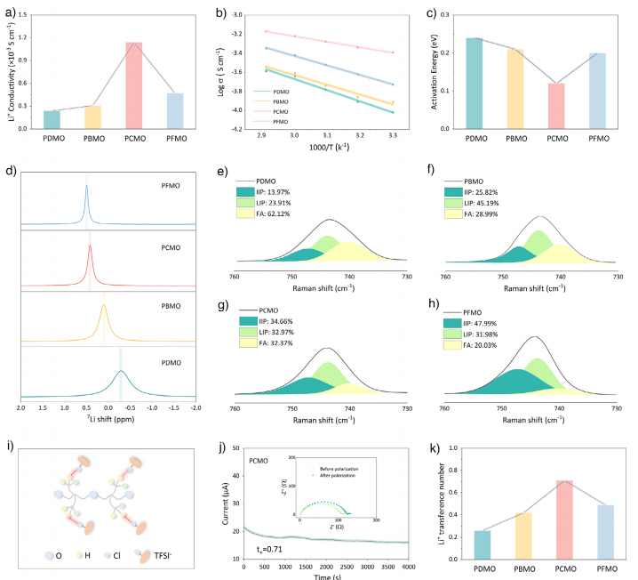 图3:离子传输表征。(a) 30 °C离子电导率:PCMO 1.14×10-3 S cm-1最高;(b) Arrhenius曲线:PCMO活化能最低0.12 eV;(c) 活化能比较柱状图;(d) 7Li ssNMR:PCMO化学位移最右、FWHM适中;(e-h) Raman:PCMO IIP比例升高、FA减少,t+提升至0.71;(i) C─H···O═S TFSI氢键示意;(j) 极化电流-时间曲线;(k) t+对比:PCMO 0.71 > PFMO 0.68 > PBMO 0.52 > PDMO 0.45。