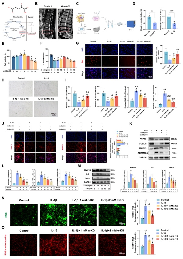 研究首先发现,在退变程度越高的人椎间盘髓核组织中,α-KG含量越低;体外用炎症因子IL-1β刺激髓核细胞也重现了α-KG的下降。补充α-KG不仅能恢复细胞增殖活力、延缓衰老,还能重塑细胞外基质代谢平衡——促进胶原合成,同时抑制基质降解酶的表达。这提示α-KG减少可能是椎间盘退变的一个关键代谢特征,而外源补充具有治疗潜力。