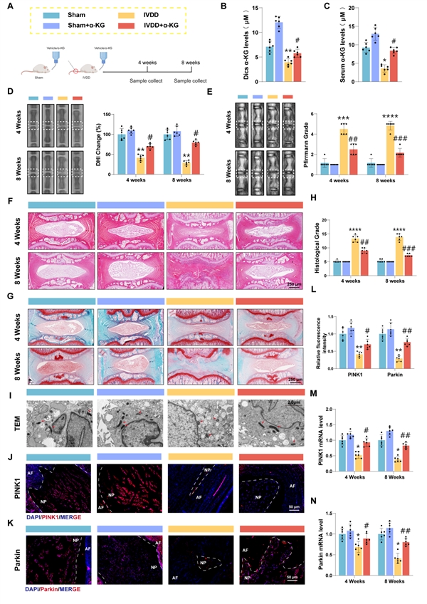 在小鼠尾椎穿刺诱导的椎间盘退变模型中,饮用水中补充α-KG能有效恢复髓核内的α-KG水平。影像学和组织学分析显示,α-KG治疗组椎间盘高度保留更好、退变评分更低,髓核结构更完整。同时,退变组织中下调的线粒体自噬关键蛋白PINK1和Parkin得以恢复,电镜下可见线粒体形态改善,从体内证实了α-KG-线粒体自噬轴的治疗作用。