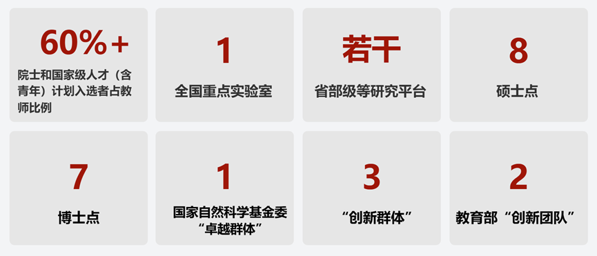 院士和国家级人才(含青年)计划入选者占教师比例的60%以上,拥有1个全国重点实验室、若干省部级等研究平台、8个硕士点、7个博士点,并有1个国家自然科学基金委“卓越群体”和3个“创新群体”,2个教育部“创新团队”。